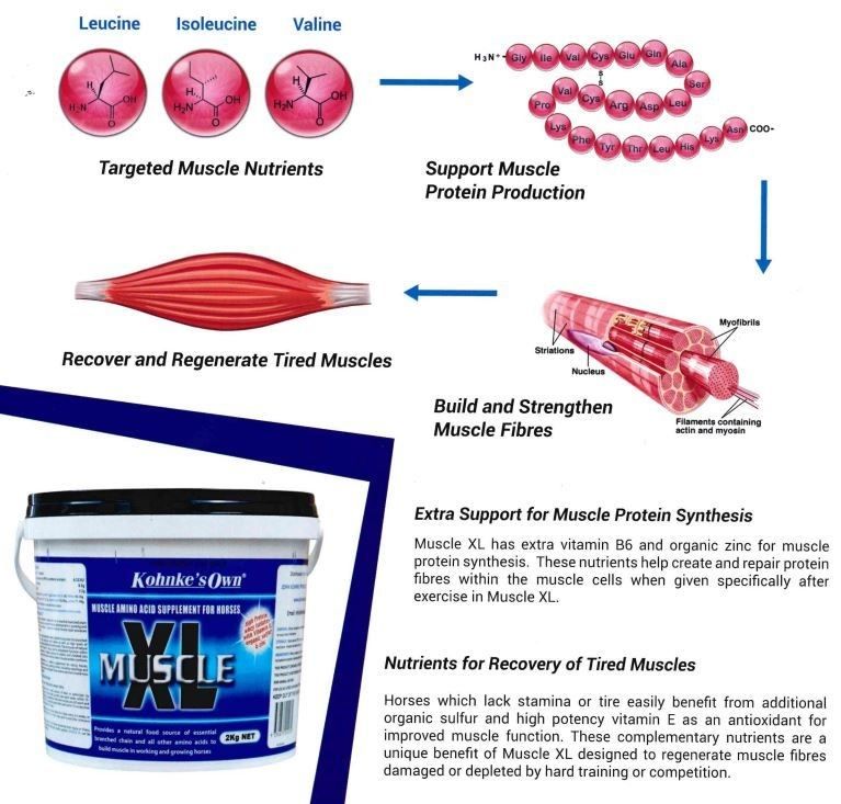 Although consistent and targeted work is essential for full top-line development, the concentrated, superior nutrients in Muscle XL® work quickly to build and strengthen lean muscle plus optimise the recovery process after exercise.