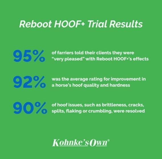 I was very impressed with the difference with Reboot HOOF+. His hooves were definitely stronger and harder. The density, quality and integrity of the hoof material was much better and my farrier could feel the difference. I highly recommend Reboot HOOF+.” Jodie D“Boots has always had problems hooves. It was very difficult to keep her shod because she had thin walls and didn’t grow hoof properly. I used many other hoof supplements without success, but her hooves have improved so much on Reboot HOOF+. She has thicker and harder walls, doesn’t have breakaways and has good quality hoof growth each trim cycle. The farrier is very impressed. I love this product and highly recommend it!” Cecilia M